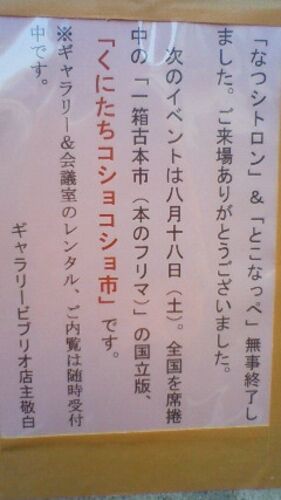 過去ログのうち美術館・画廊レビュー関連の話題は こちらをクリックしてご覧ください。−−−−−−−−−−−−−−−−さ、出かけようかと言うところで来客。「国立本店」の丸山さん。8月18日にギャラリービブリオで実施予定の一箱古本市「くにたちコショコショ市」のフ…